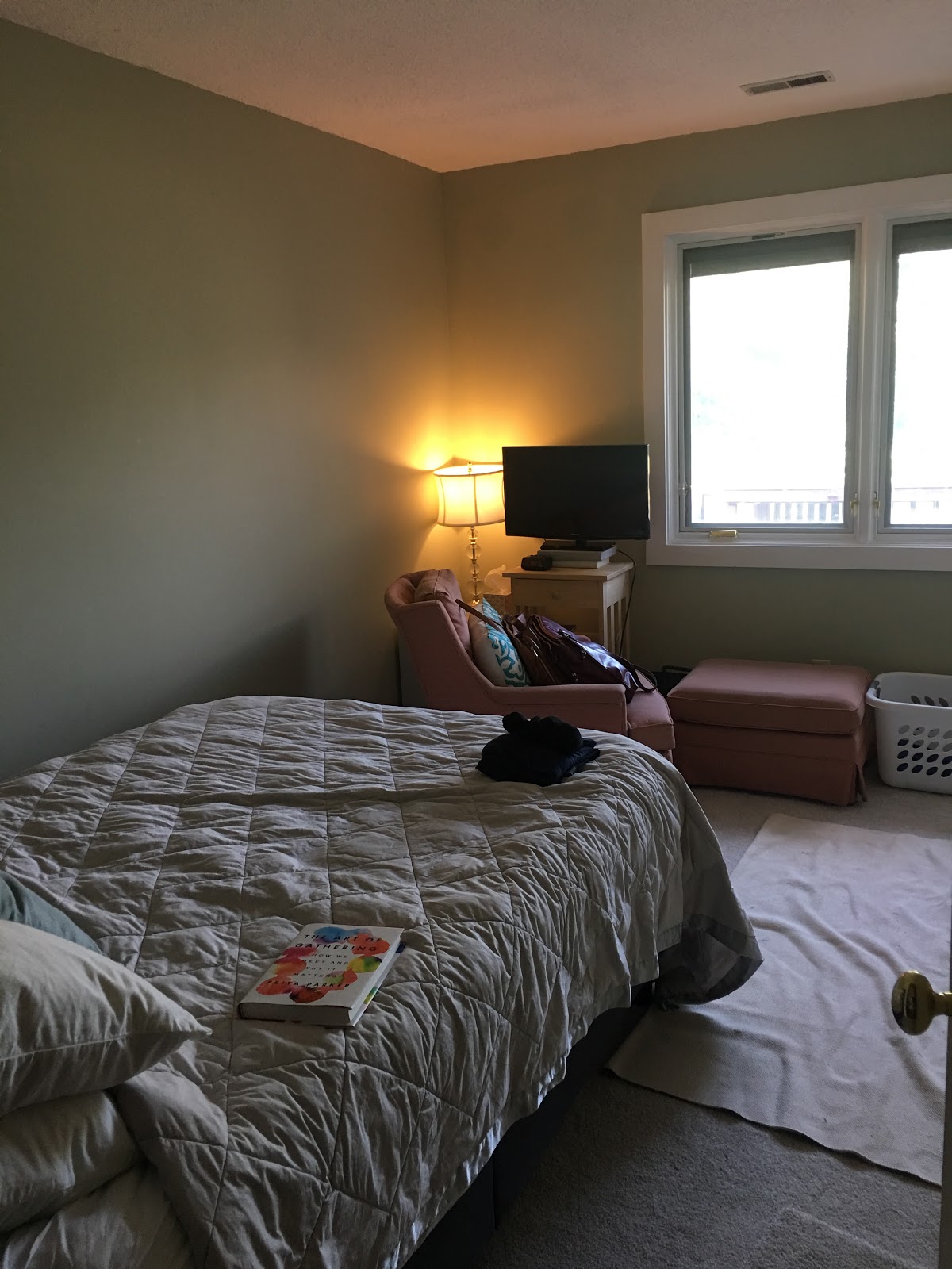 This is a real-life look at how we rearranged our bedroom/living room/office where we spend all our evening time. Since then we swapped out the lamp for a taller floor lamp and added a lovely contractor garbage bag to block some light in the morning, plus a cute house plant to purify the air or whatever it is they do. It's cute anyway. Once we spread out in the rest of the house, this will be a comfy guest room.